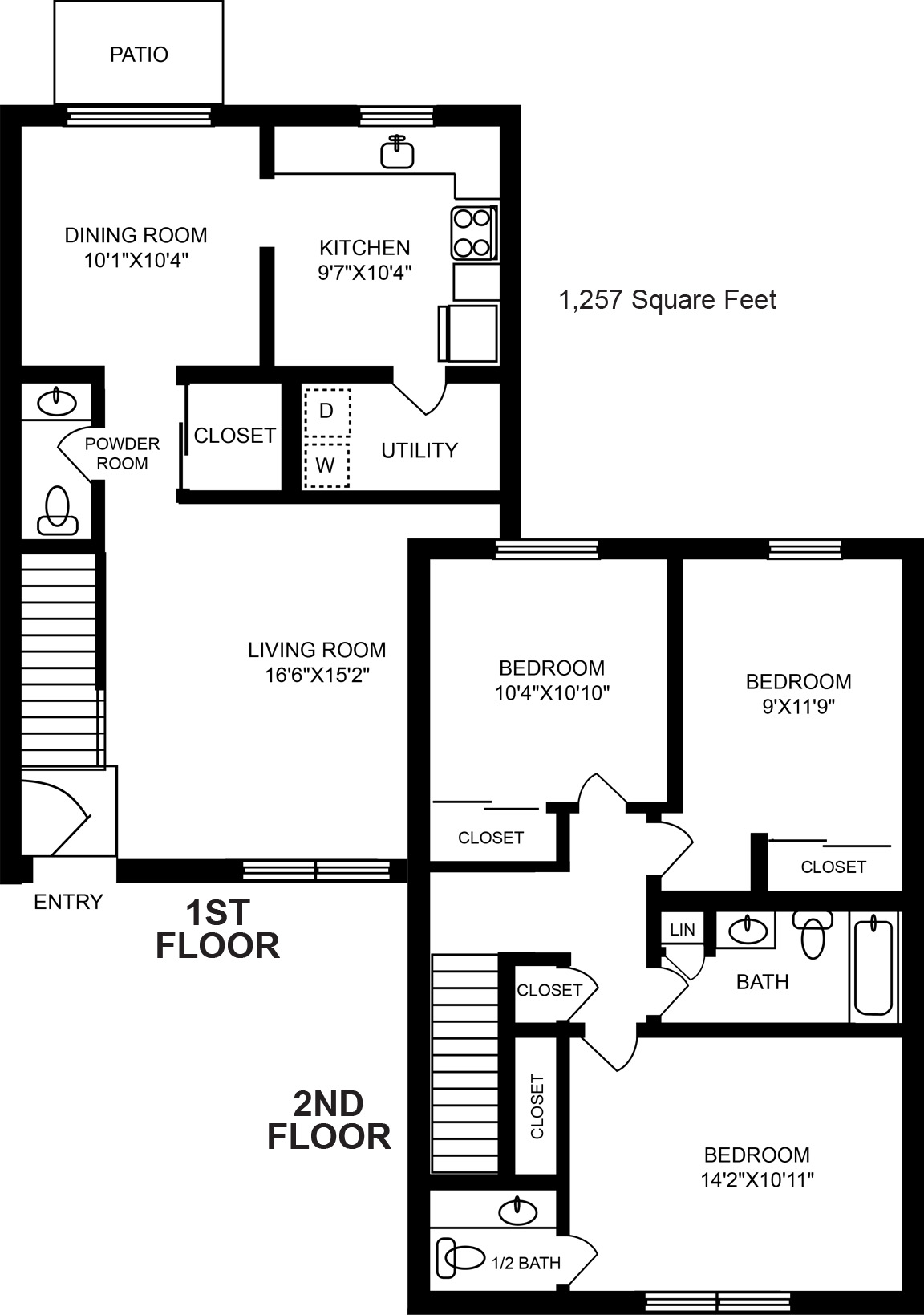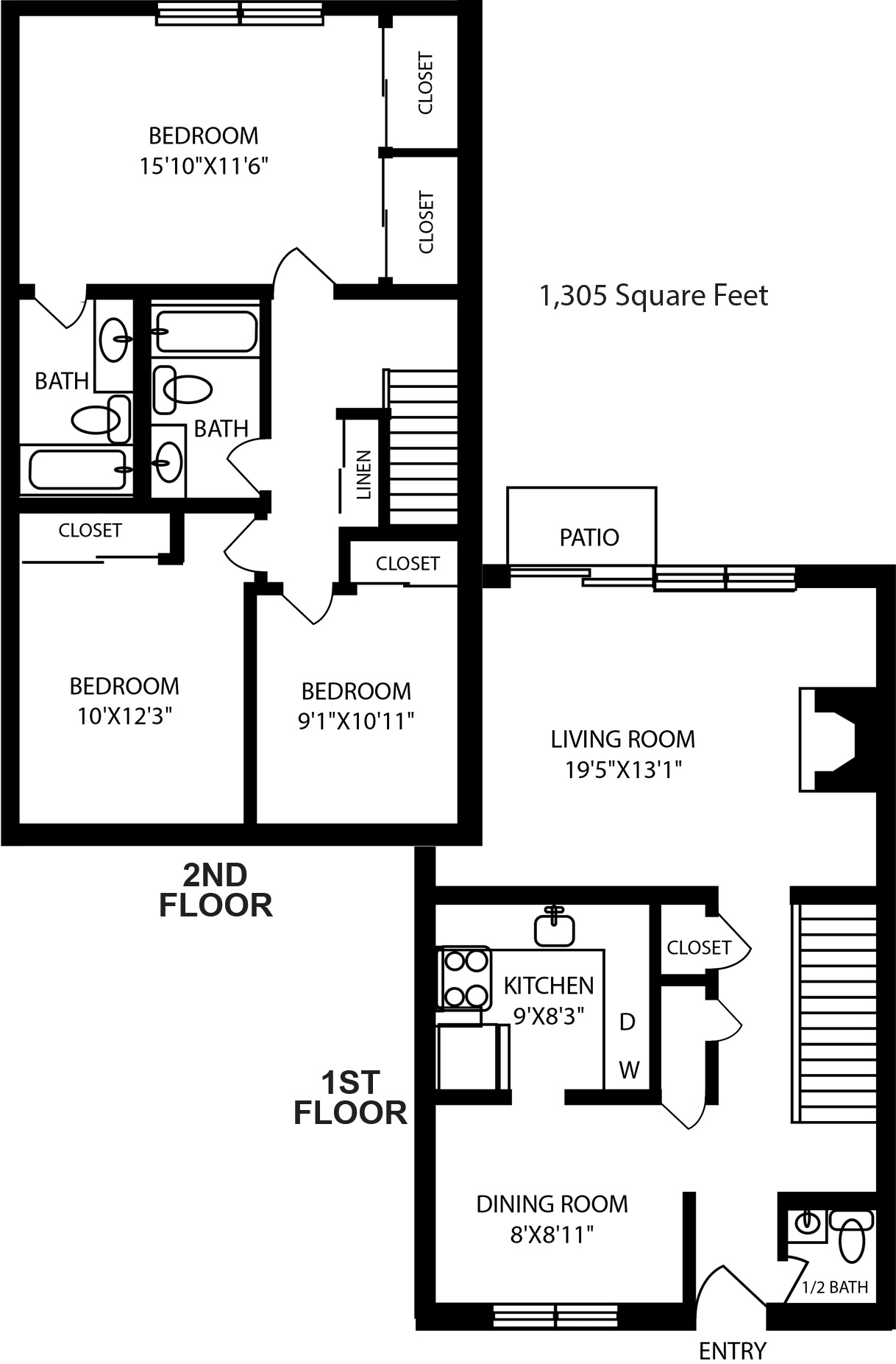 Three Bedroom Townhouse, One Full and Two Half Baths